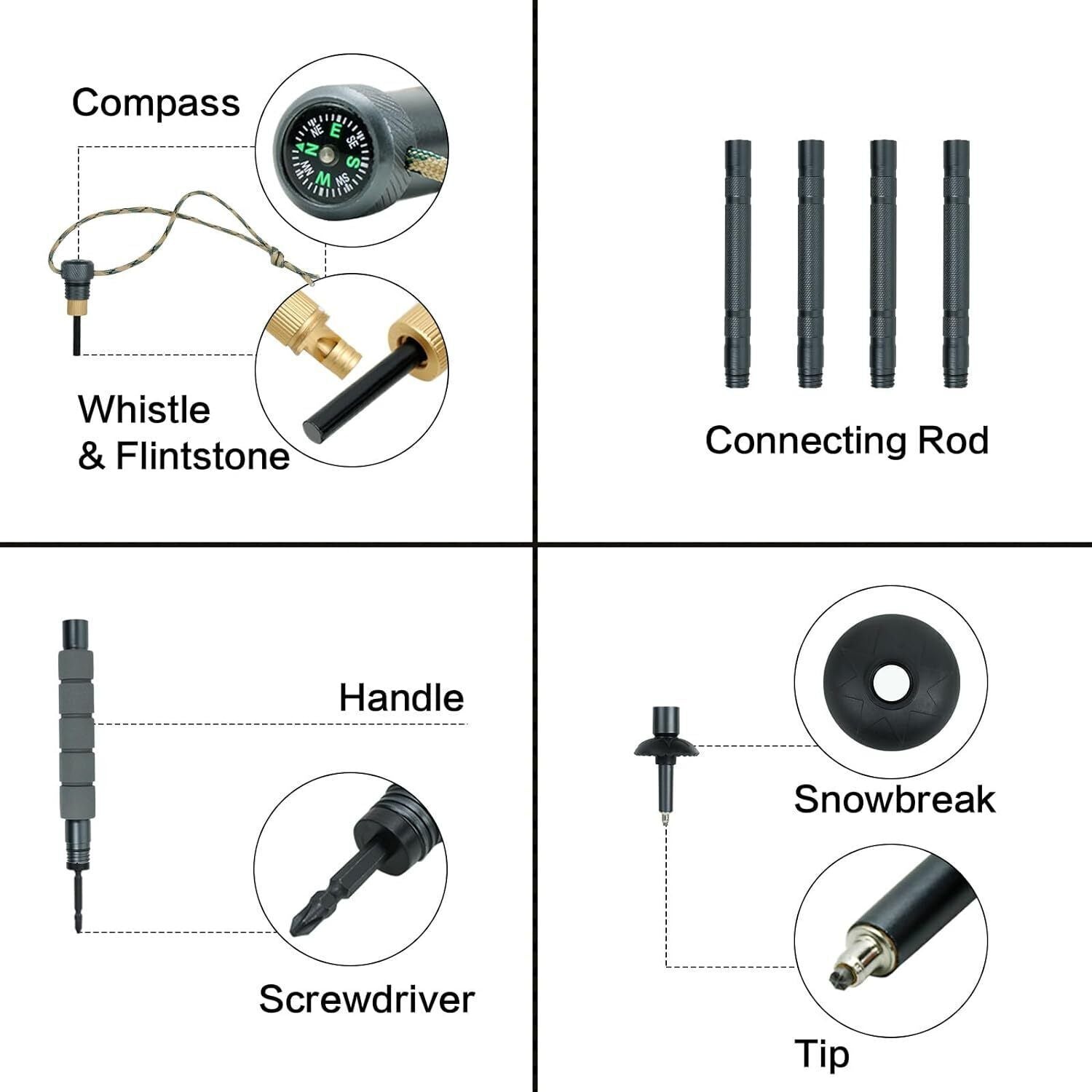 - Adjustable & Well-Equipped: These poles come with various accessories, eliminating the need for additional tools. You can easily switch between metal and rubber tips or double and flat-head screwdrivers. The poles can extend up to 20cm to suit your height. They also include a whistle for emergency signals and a compass to help navigate complex terrains.